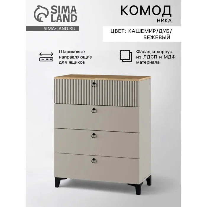 - Материал (ЛДСП): Обеспечивает прочность и долговечность конструкции, что делает комод надежным в эксплуатации.