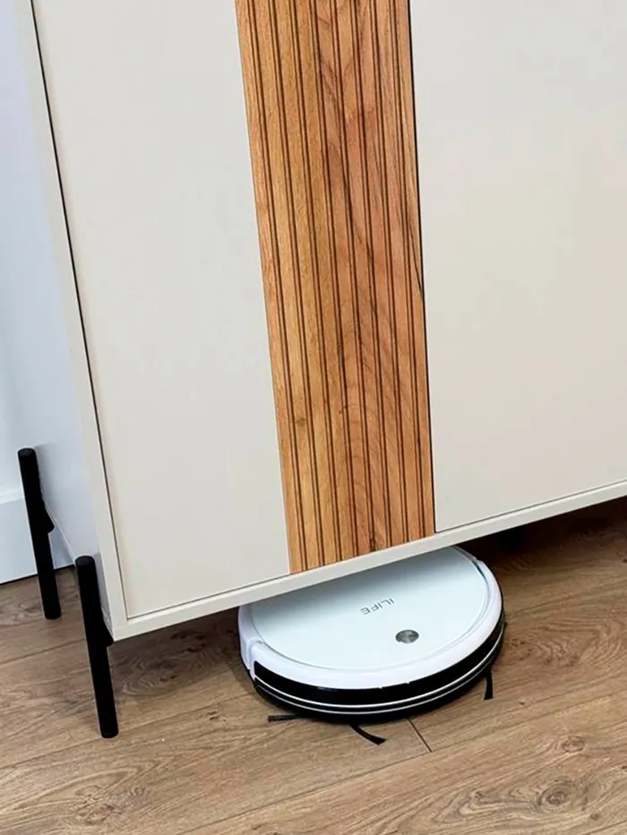 - Высокие ножки обеспечивают увеличенное расстояние от пола, появляется дополнительная зона для размещения декоративных элементов или обуви, делая пространство многофункциональным.