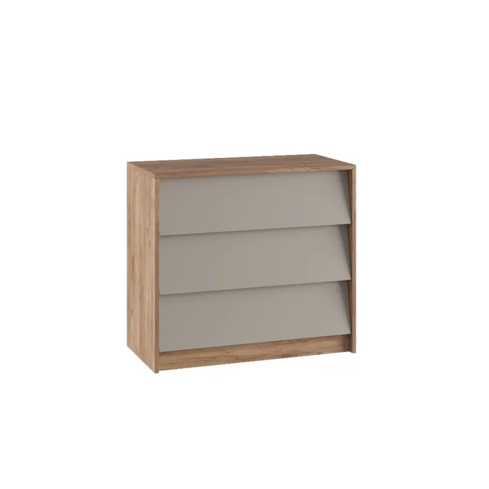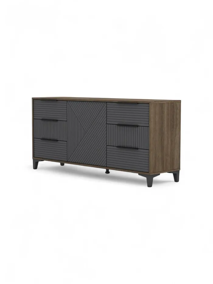 Главная особенность комода «Доминика» заключается в оригинальном сочетании отделки фасада. Одна сторона представляет собой рельефный фасад, выполненный в благородном оттенке «дуб крафт золотой».