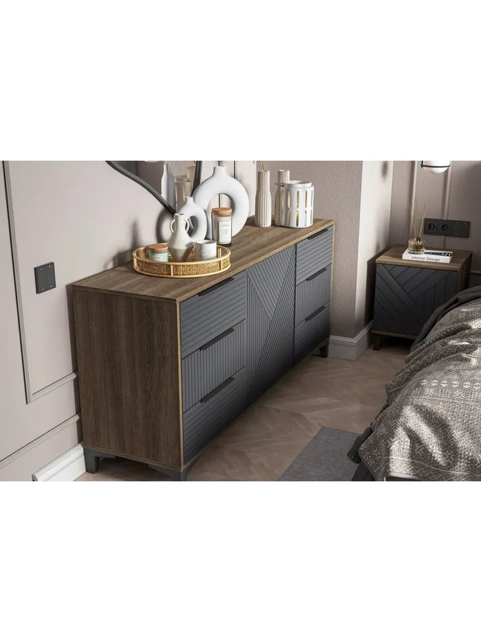 Комбинация полки, закрытой дверцей, и выдвижных ящиков, обеспечивает возможность организовать хранение самых разных вещей. Оснащен шестью выдвижными ящиками, которые идеально подходят для хранения мелких предметов, одежды или белья. Глухая дверца скрывает содержимое от посторонних глаз, помогая поддерживать порядок и эстетику в комнате. Позволяет разместить всё необходимое: посуду и столовые приборы, книги и журналы, одежду и аксессуары, постельное бельё и полотенца.