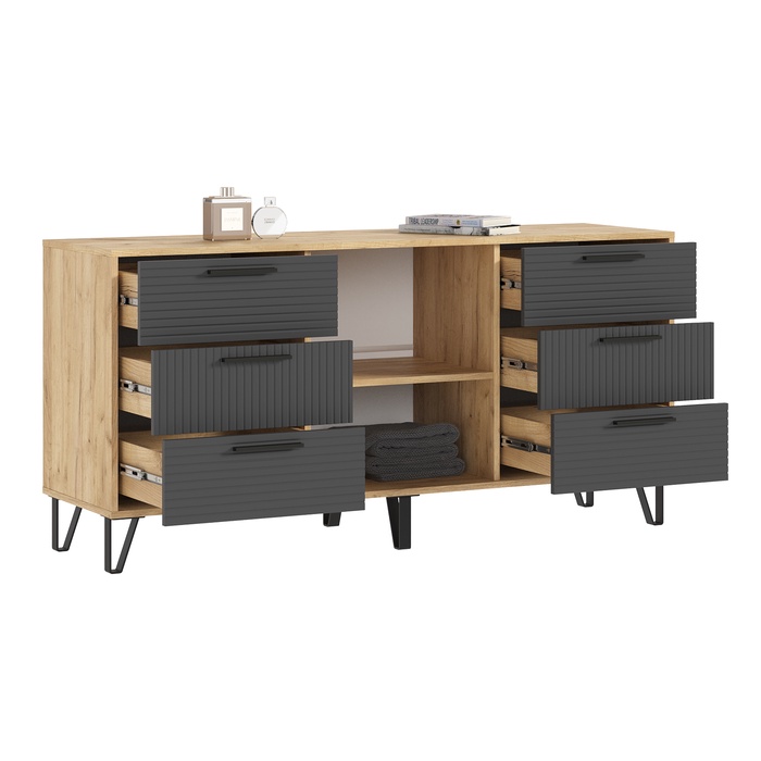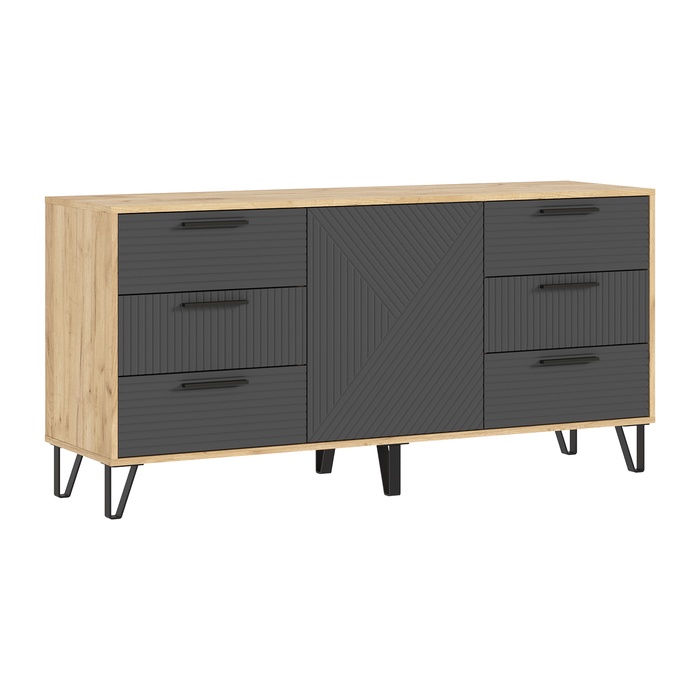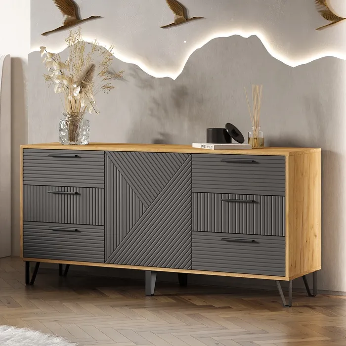 - Современный дизайн: сочетание светлой древесины и графитовых фасадов с геометрическим узором придаёт комоду современный и стильный вид.