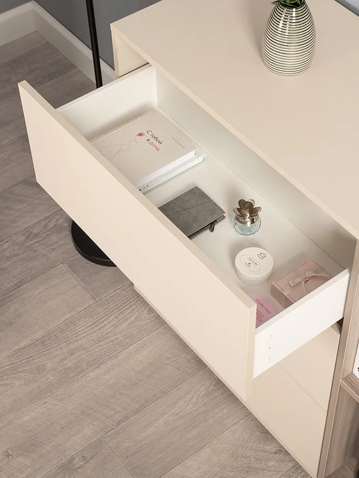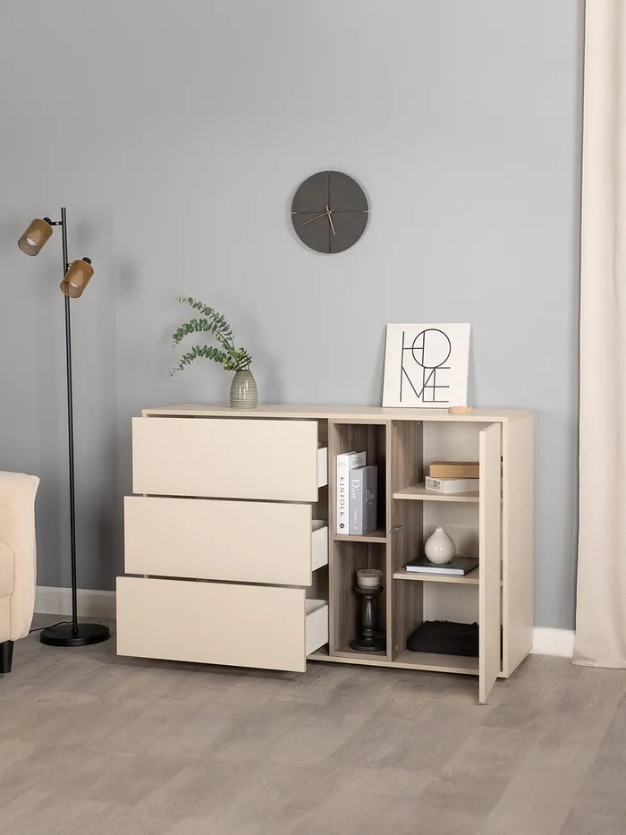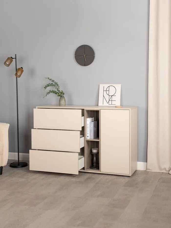 Станет стильным дополнением интерьера благодаря элегантному сочетанию цветов сатин и эмили блаш. Вместительный предмет мебели оснащен открытой нишей, шкафов и тремя удобными выдвижными ящиками на шариковых направляющих, обеспечивающих плавное открывание и закрывание. Модель выполнена из ЛДСП, гарантирующего долговечность и надежность конструкции. Размеры комода составляют 1299х396х848 мм, позволяя оптимально организовать пространство даже в небольших помещениях.