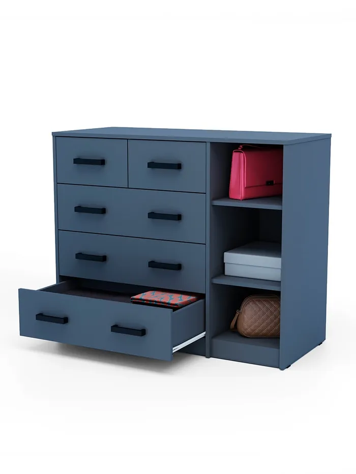 Комод 5 ящиков с дверью, 1100х480х900 - большой и вместительный. Удобный вариант мебели для хранения белья, постельных принадлежностей и личных вещей. Данная модель выглядит компактно и визуально не загромождает пространство. Она позволит вместить большое количество вещей. Ящики изделия выдвигаются полностью и плавно, не упираясь в стенки. Тумба универсального цвета без труда подойдёт под спальный гарнитур и оформление комнаты.