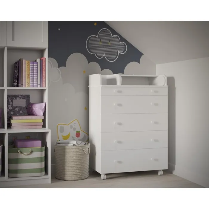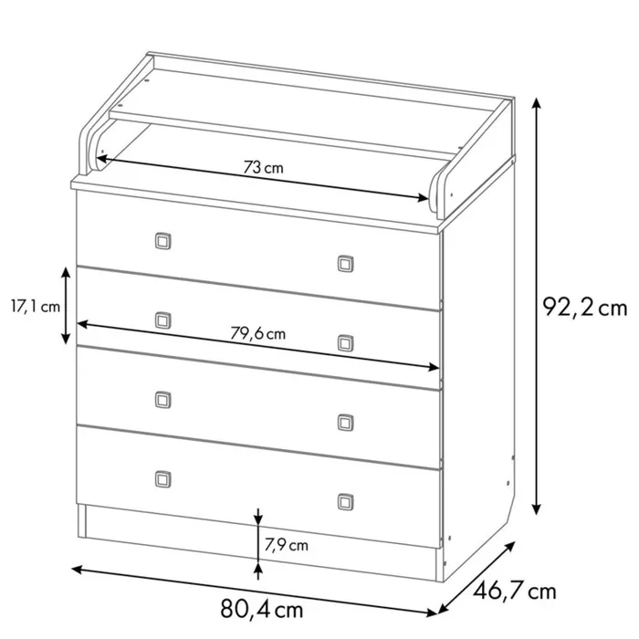 Вместительные выдвижные ящики комода шириной 80 см с системой плавного закрытия позволят удобно хранить все детские принадлежности. Когда малыш вырастает из возраста пеленания, поверхность может быть снята, тогда комод приобретет классический вид.