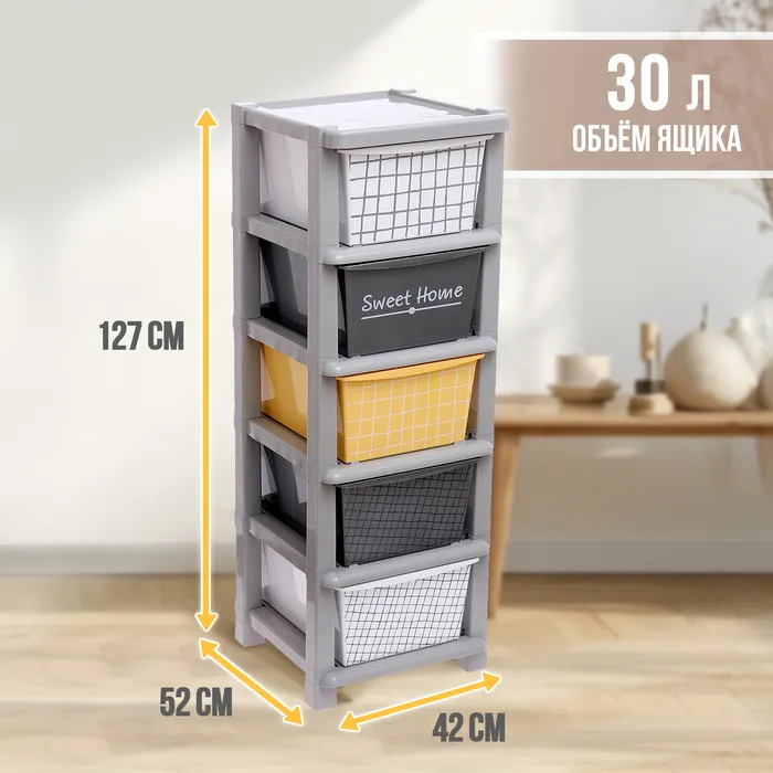 Универсальный пластиковый комод с пятью секциями — это практичное решение для организации хранения в вашем доме. Его компактные размеры позволяют разместить его даже в небольших помещениях, а легкий вес облегчает перемещение при необходимости.