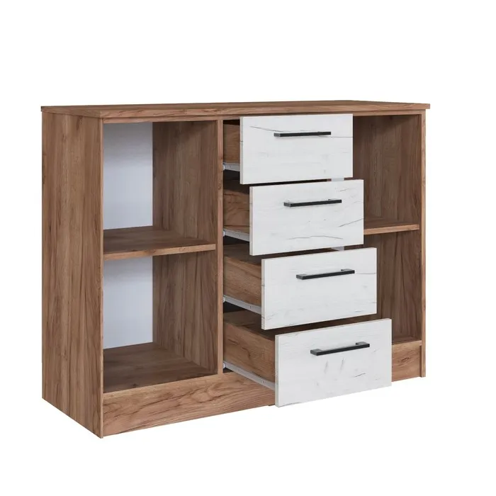 Комод Вегас, 1102х434х850, Дуб крафт табачный/дуб крафт белый (Спальня Вегас) – это трендовое сочетание цветов в спокойных древесных оттенках. В 4 выдвижных ящиках с роликовыми направляющими можно разместить одежду, белье и другие необходимые предметы, а на полках в нишах с распашными дверцами поместится все необходимое для вашей спальни.
