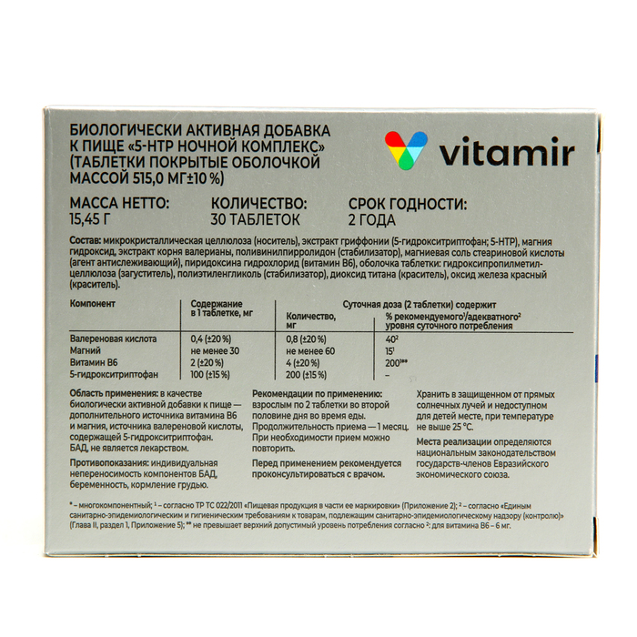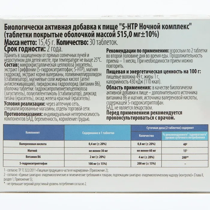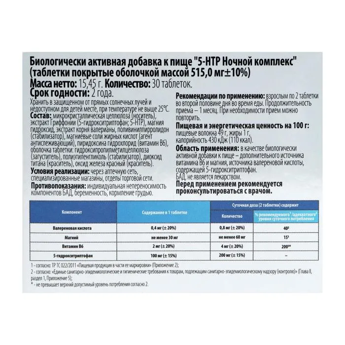 «5-НТР Ночной комплекс» содержит компоненты, которые при соблюдении принципов гигиены сна способствуют облегчению засыпания и восстановлению запасов энергии, необходимых для ежедневной работы и жизнедеятельности.