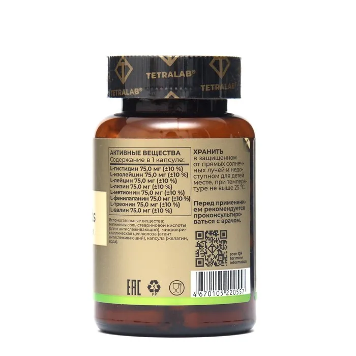 Состав: L-лизина гидрохлорид, L-гистидин, L-изолейцин, L-лейцин, L-метионин, L-фенилаланин, L-треонин, L-валин, магниевая соль стеариновой кислоты Е470 (агент антислеживающий), микрокристаллическая целлюлоза Е460 (агент антислеживающий), капсула (желатин, вода).