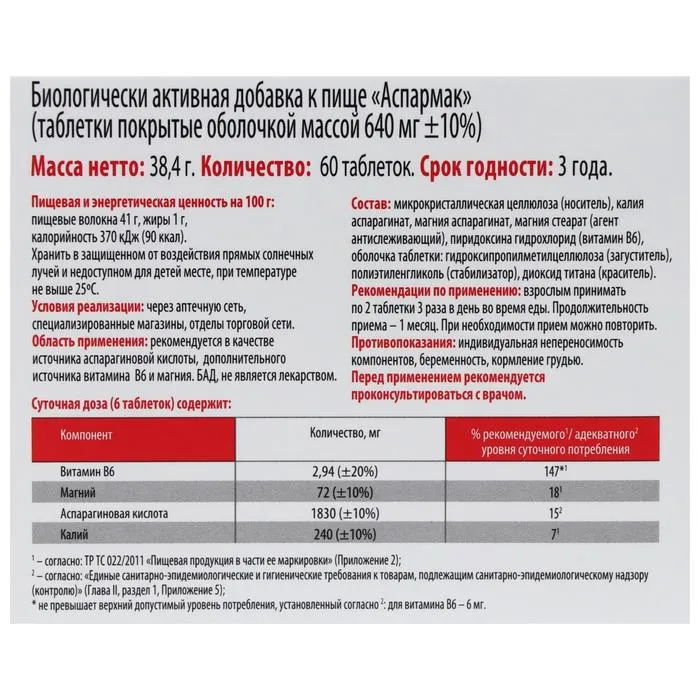 Комплекс «Аспармак», 60 таблеток — Характеристики