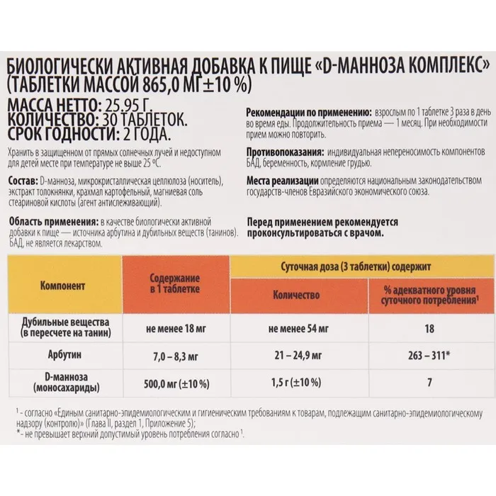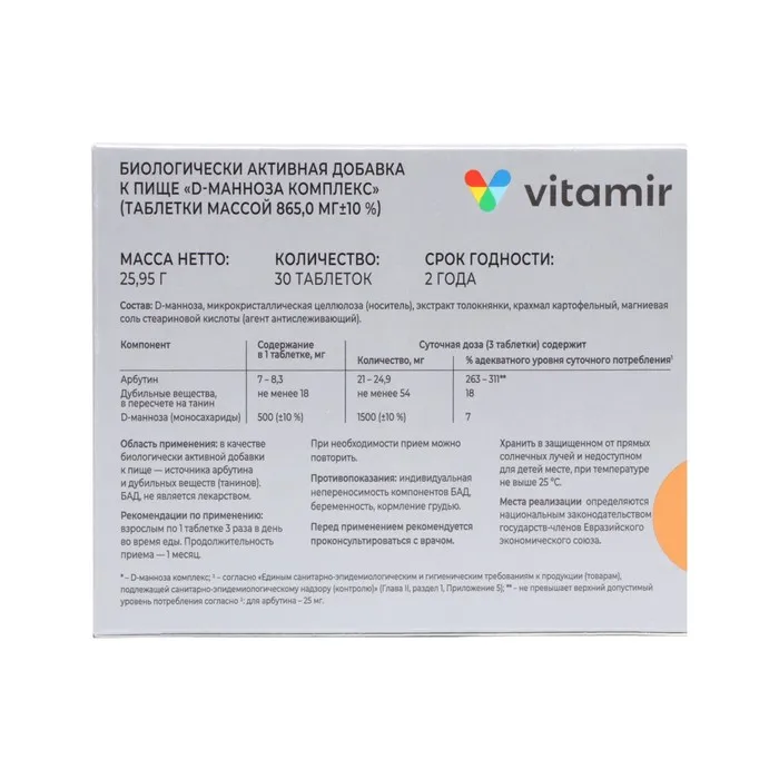 Комплекс D-манноза ВИТАМИР таб. №30 — Характеристики