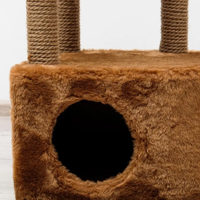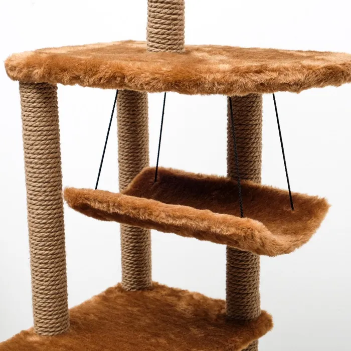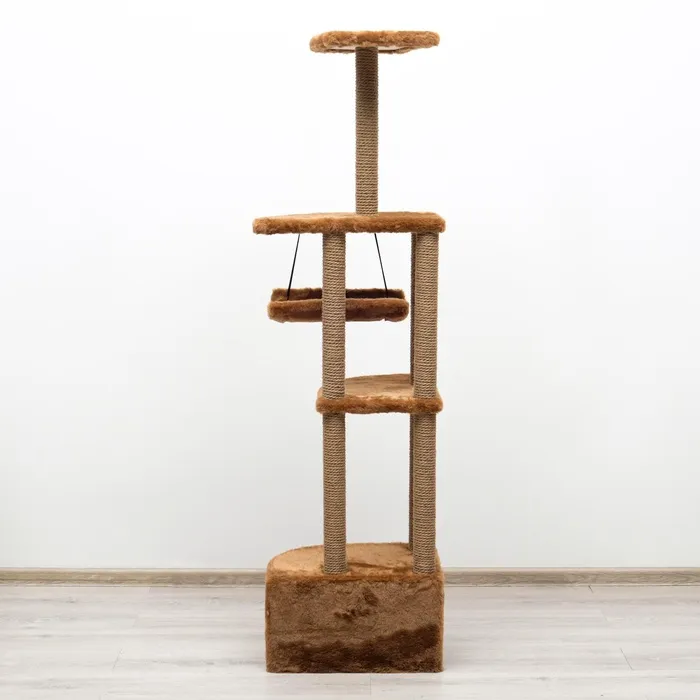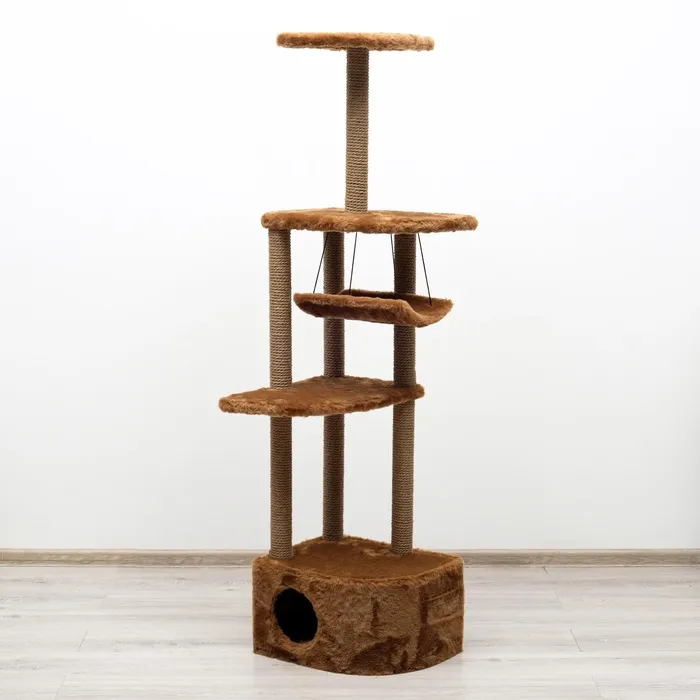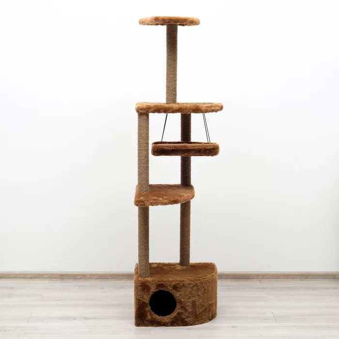 Комплекс включает в себя просторный закрытый домик на первом этаже, который станет любимым укромным уголком для вашего питомца. Второй и третий этажи оснащены удобными платформами, где ваша кошка сможет оттачивать свои навыки прыжков или просто наблюдать за происходящим вокруг. Кроме того, здесь предусмотрен подвесной гамак — идеальное место для расслабления и сна.