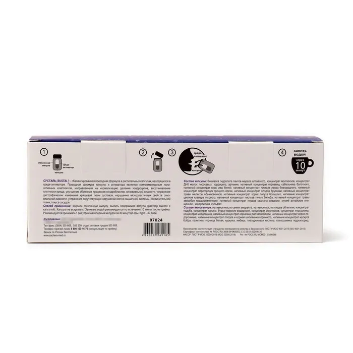 Состав капсулы: биомасса гидролата пантов марала алтайского, концентрат моллюсков, концентрат ДНК молок лососевых, кордицепс, артемия, нативный концентрат корневищ сабельника болотного, нативный концентрат коры ивы белой, нативный концентрат листьев лавра благородного, нативный концентрат перегородок грецкого ореха, нативный концентрат плодов брусники, нативный концентрат травы мелиссы обыкновенной, нативный концентрат корня лопуха большого, нативный концентрат цветков клевера лугового, нативный концентрат листьев гинкго билоба, нативный концентрат травы зверобоя продырявленного, нативный концентрат плодов каштана сладкого, мумиё алтайское очищенное, хондроитина сульфат.