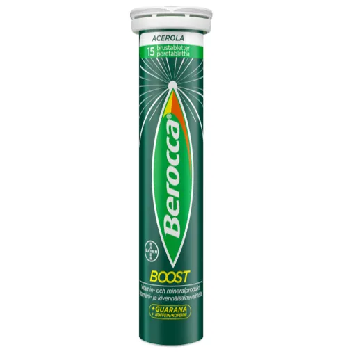 Berocca Boost современный витаминный препарат, поддерживающий организм в период активных умственных нагрузок, в период стресса и усталости. Содержит все витамины группы B, витамин С, цинк, магний и экстракт гуараны. Витамины B2, B3, B5, B6, B12 и витамин С, и магний помогают снизить чувство утомления. Содержащийся кофеин растительного происхождения (гуарана) оказывает стимулирующее действие.