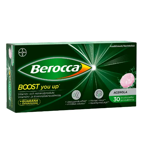 Berocca Boost современный витаминный препарат, поддерживающий организм в период активных умственных нагрузок, в период стресса и усталости. Содержит все витамины группы B, витамин С, цинк, магний и экстракт гуараны. Витамины B2, B3, B5, B6, B12 и витамин С, и магний помогают снизить чувство утомления. Содержащийся кофеин растительного происхождения (гуарана) оказывает стимулирующее действие.