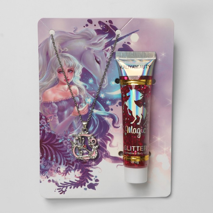 Этот комплект станет отличным подарком для девочек, добавив яркости и веселья в их стиль. Кулон с единорогом символизирует фантазийный мир, где сбываются мечты, а глиттер делает аксессуар еще более привлекательным и необычным. Отлично подойдет для ежедневных нарядов или особых случаев.