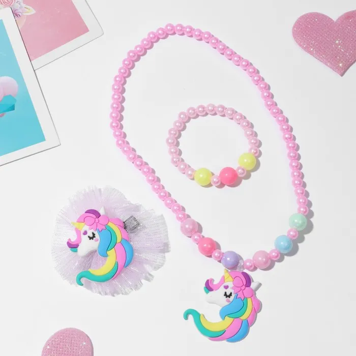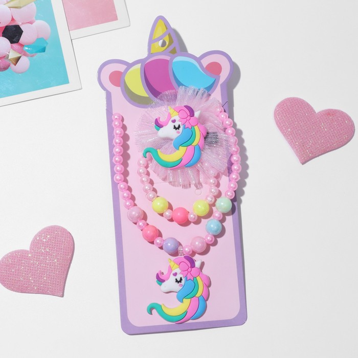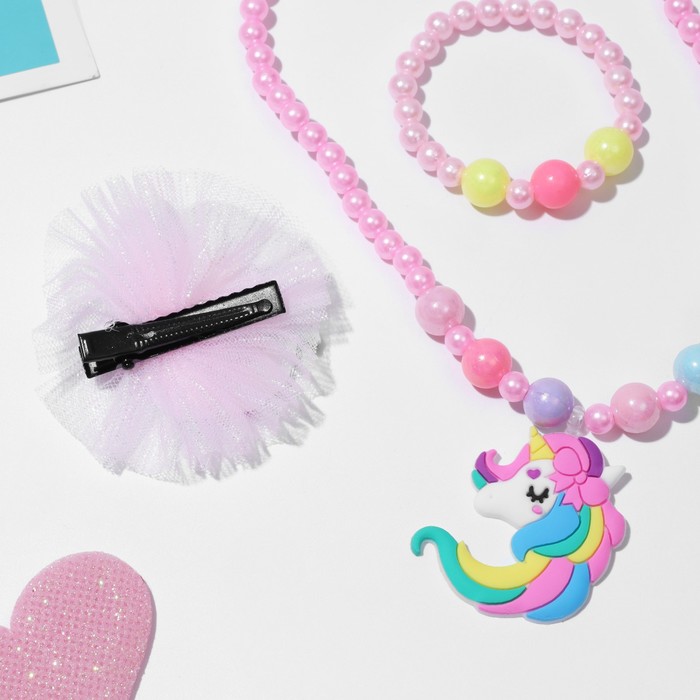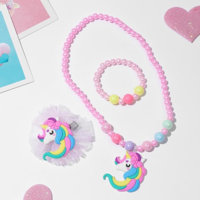Комплект детский «Выбражулька» 3 предмета: заколка, кулон, браслет d=5 см., единорог, розовый