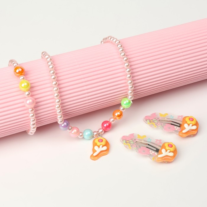 Комплект детский «Выбражулька» 4 предмета: 2 заколки, кулон, браслет d=6 см., цветы, бежевый