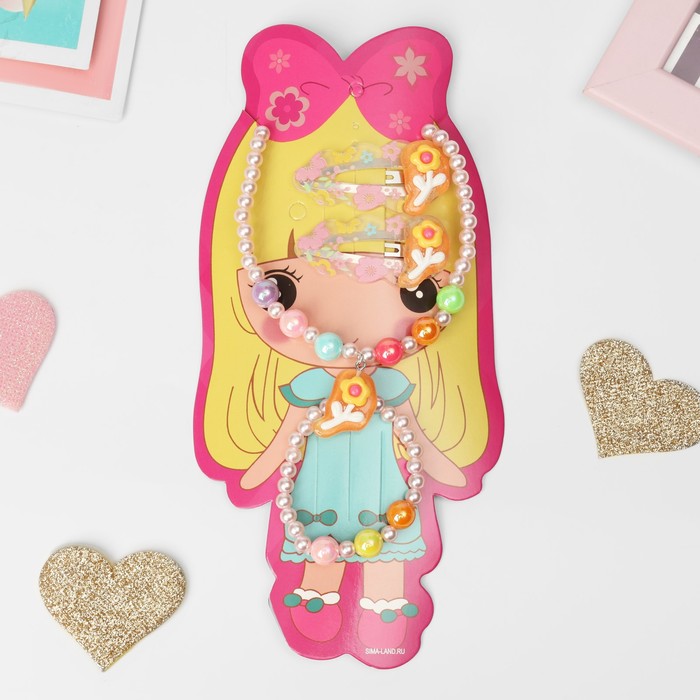 Комплект детский «Выбражулька» 4 предмета: 2 заколки, кулон, браслет d=6 см., цветы, бежевый — Характеристики