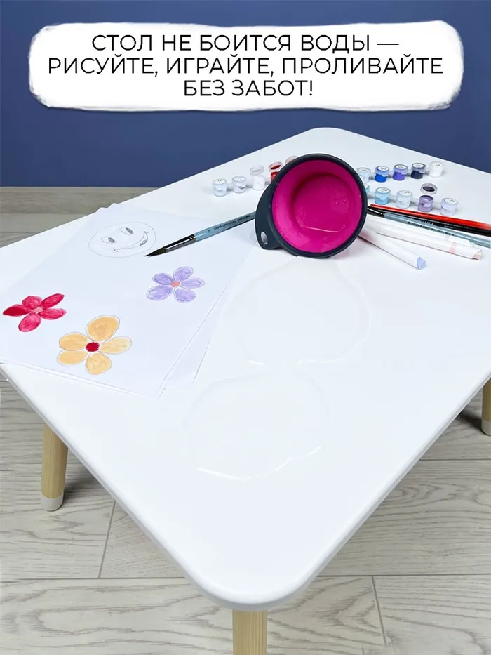 - Устойчивость к влаге: уникальное покрытие столешницы не боится воды, что позволяет ребенку заниматься творчеством, рисовать, мастерить поделки или перекусывать без риска повредить мебель.