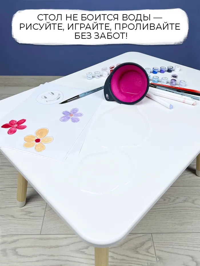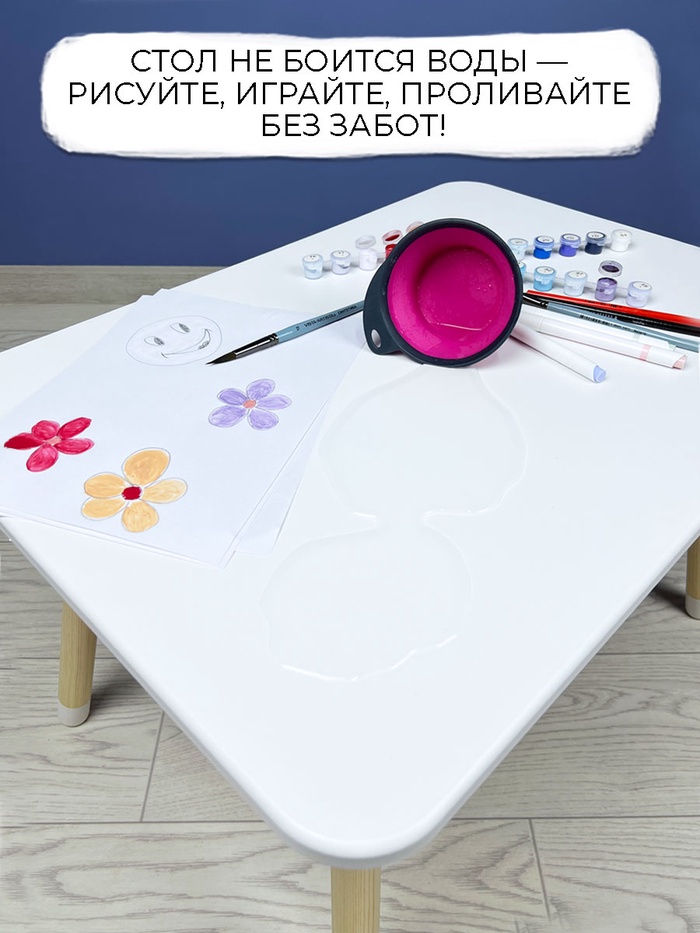 - Устойчивость к влаге: уникальное покрытие столешницы не боится воды, что позволяет ребенку заниматься творчеством, рисовать, мастерить поделки или перекусывать без риска повредить мебель.