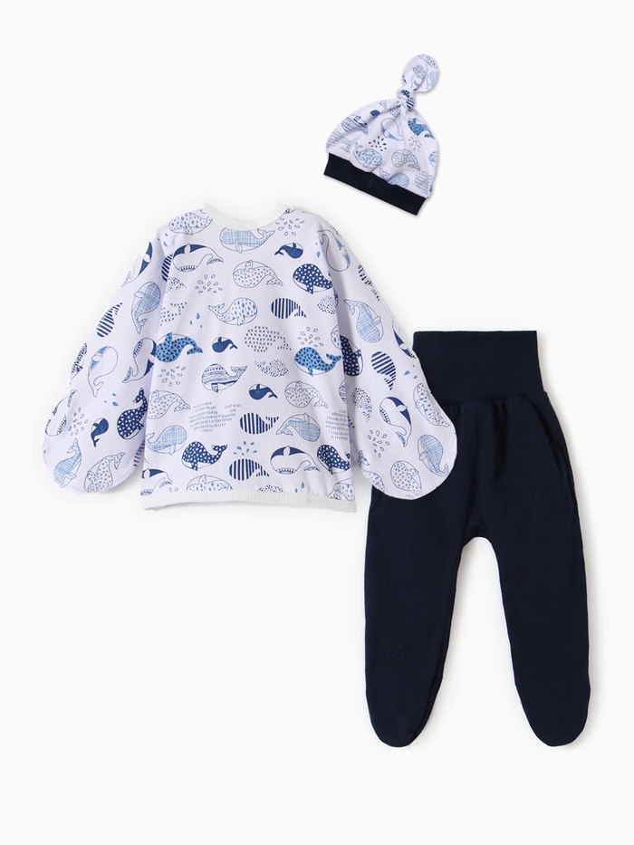Комплект для новорожденного (шапочка/кофточка/ползунки) "Киты", цвет белый/синий, рост 56 см — Характеристики