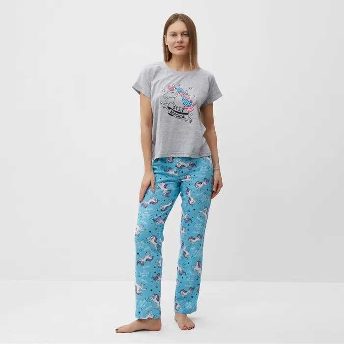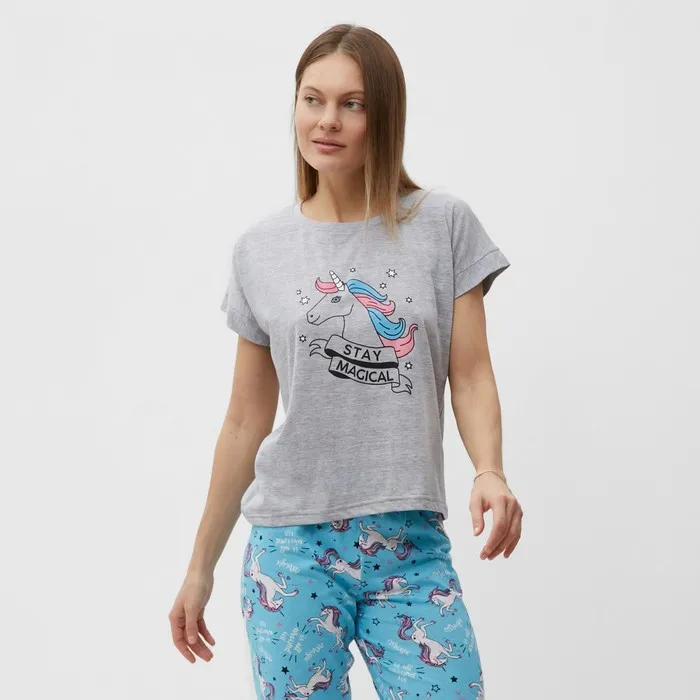Комплект домашний женский "Единорог" (футболка/брюки), цвет серый/голубой, размер 46 — Характеристики