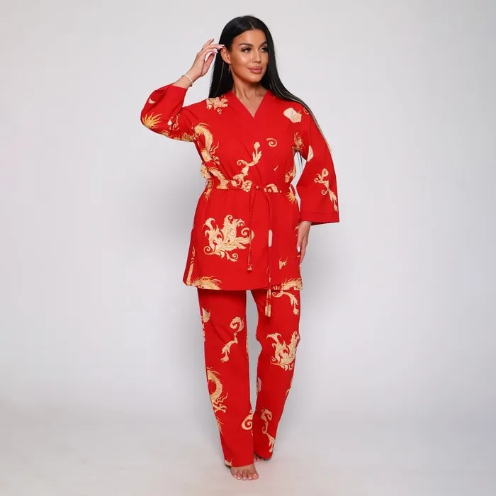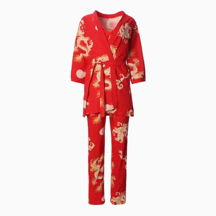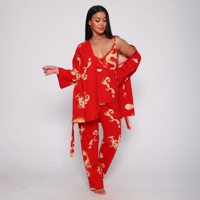 Комплект домашний женский (халат, топ, брюки), красный, размер 52