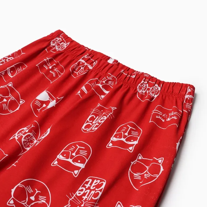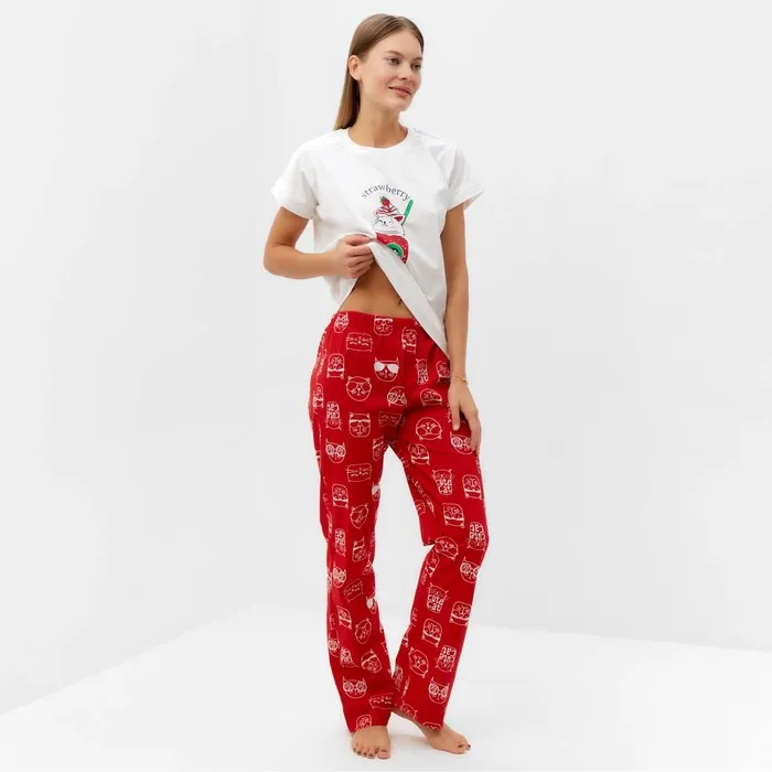 Комплект домашний женский "Котенок в стакане" (футболка/брюки), цвет белый/красный, размер 44