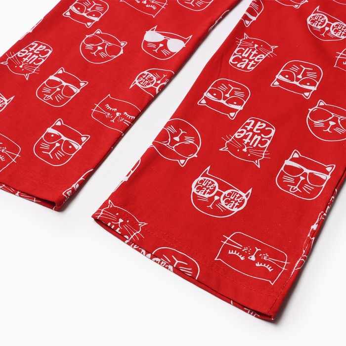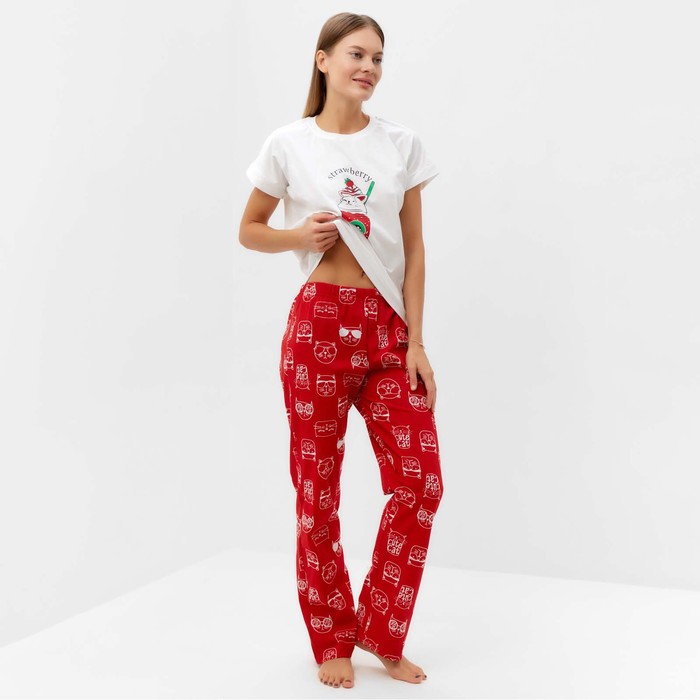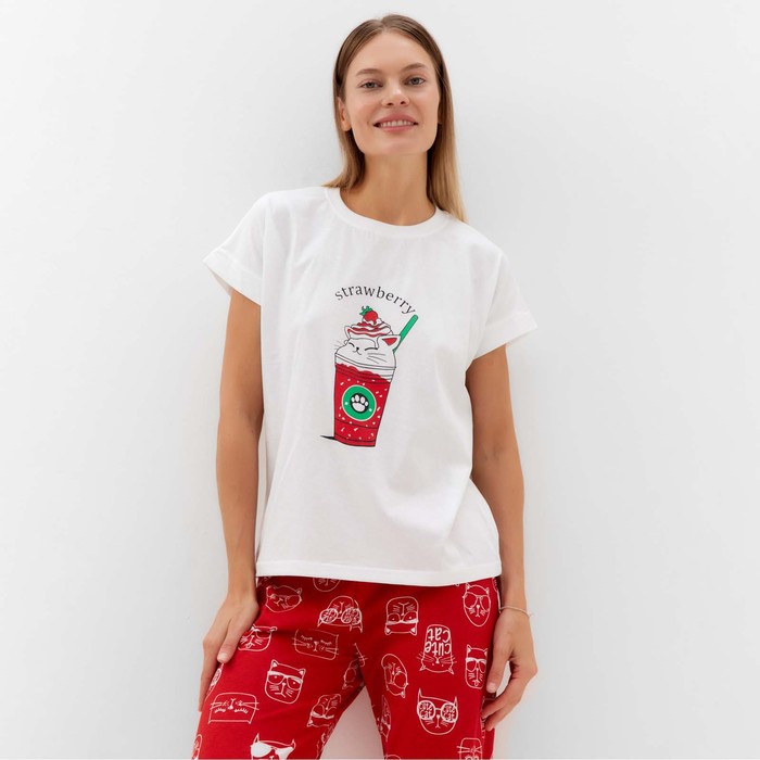 Комплект домашний женский "Котенок в стакане" (футболка/брюки), цвет белый/красный, размер 50