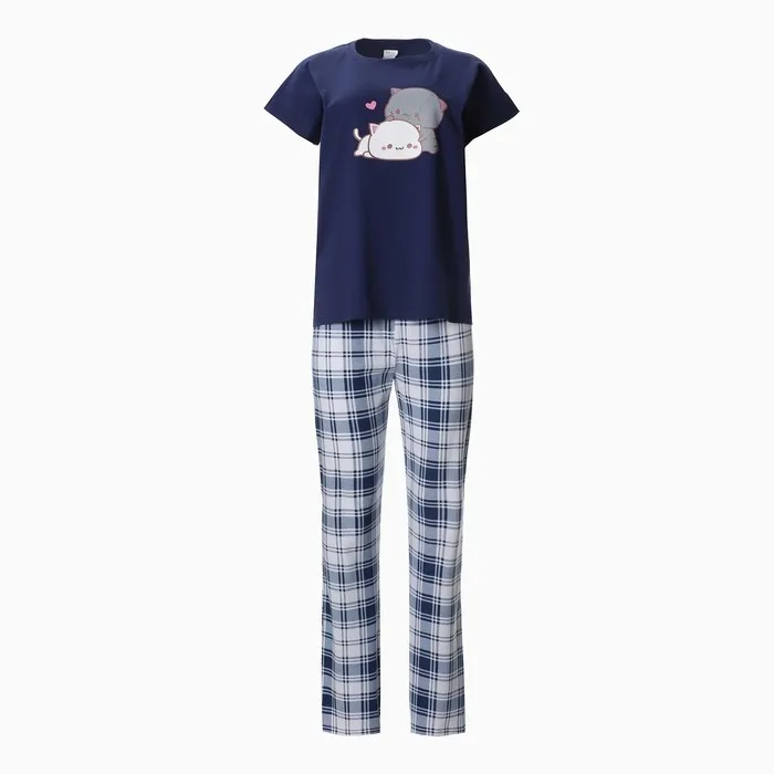 Комплект домашний женский "Котята" (футболка/брюки), цвет синий/бежевый, размер 52