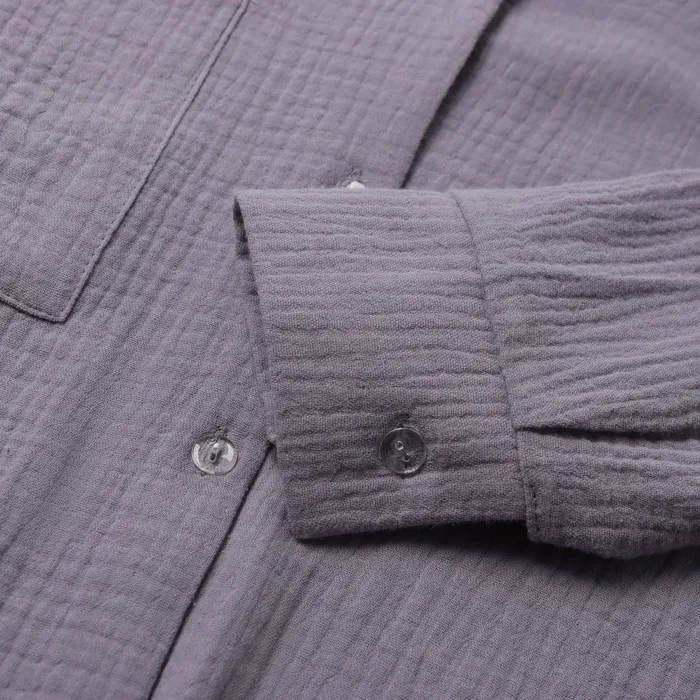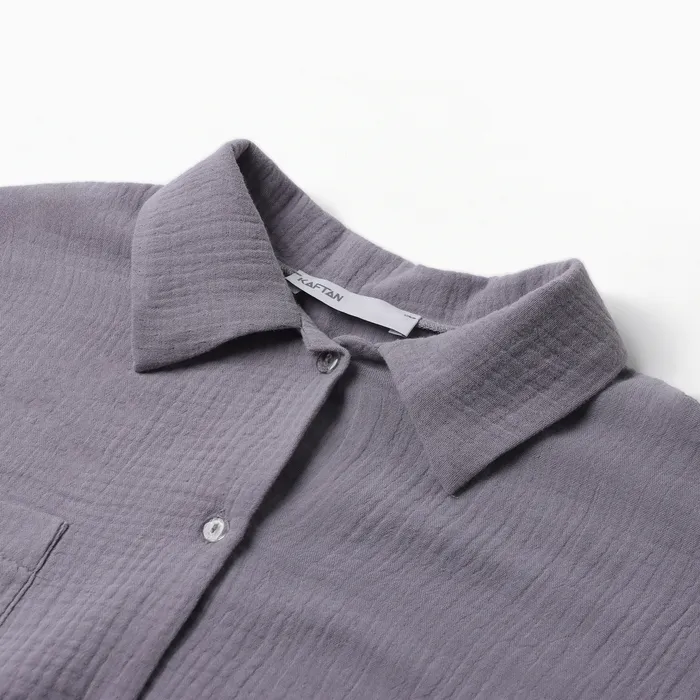 Минималистичный простой дизайн и натуральная фактура ткани делают этот наряд стильным решением для дома. Накладной карман рубашки добавляет функциональности, а классический отложной воротничок подчеркивает его утончённость. Ширина брючин и свободный покрой брюк обеспечивают удобство носки.