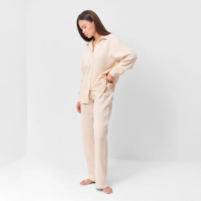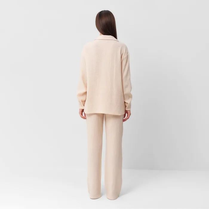 Домашний костюм из рубашки и брюк от бренда KAFTAN в молочном оттенке станет отличным выбором для любой женщины, ищущей комфорт и стиль в однотонной одежде. Выполненный из мягкого муслина, этот комплект обеспечит максимальный комфорт благодаря натуральной хлопковой ткани.
