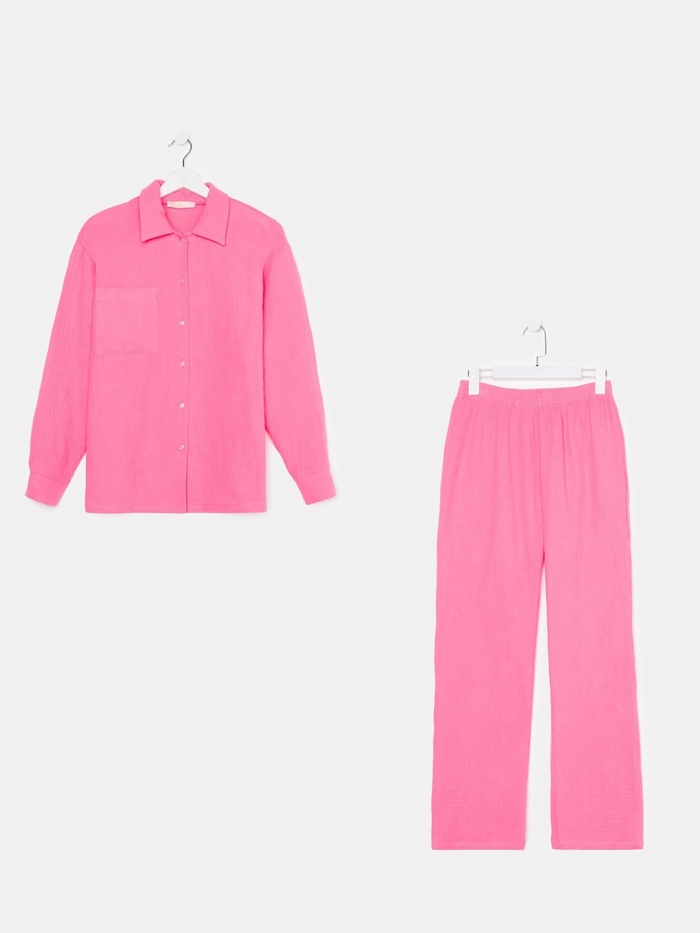 Этот домашний костюм для женщин в нежно-розовом цвете сочетает в себе стиль и комфорт. Комплект включает в себя рубашку и брюки, выполненные из мягкого муслина, идеально подходящего для ношения дома.