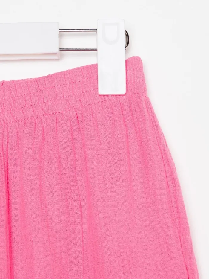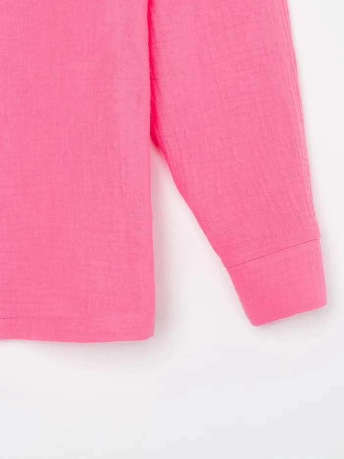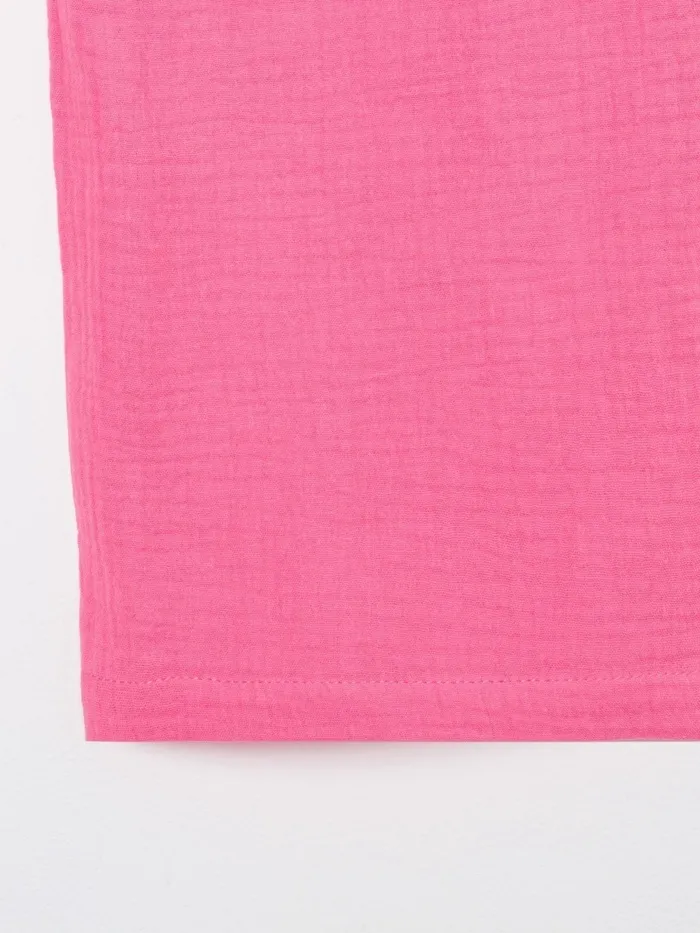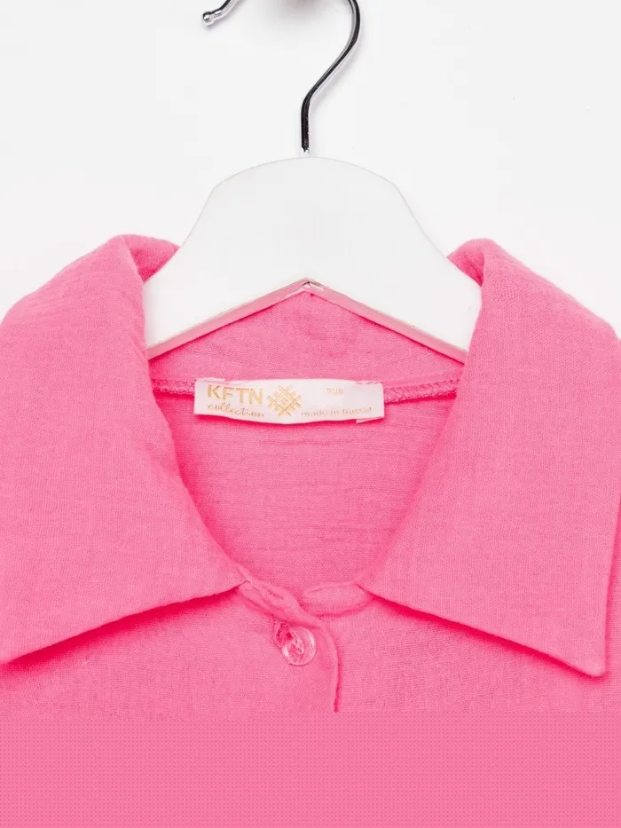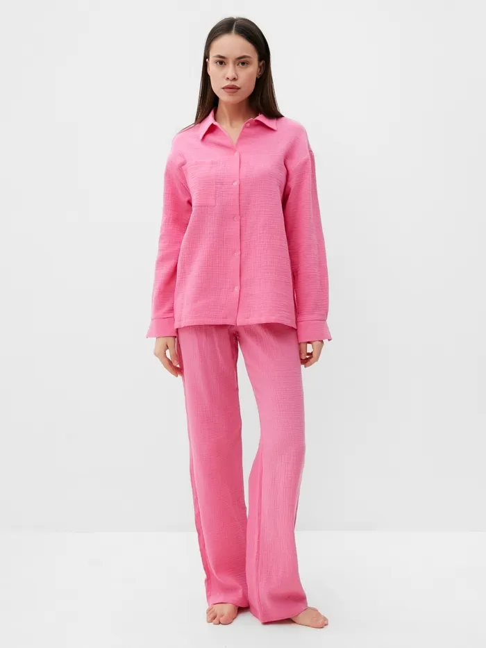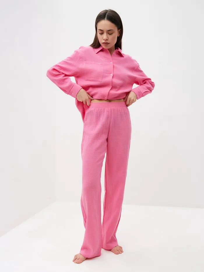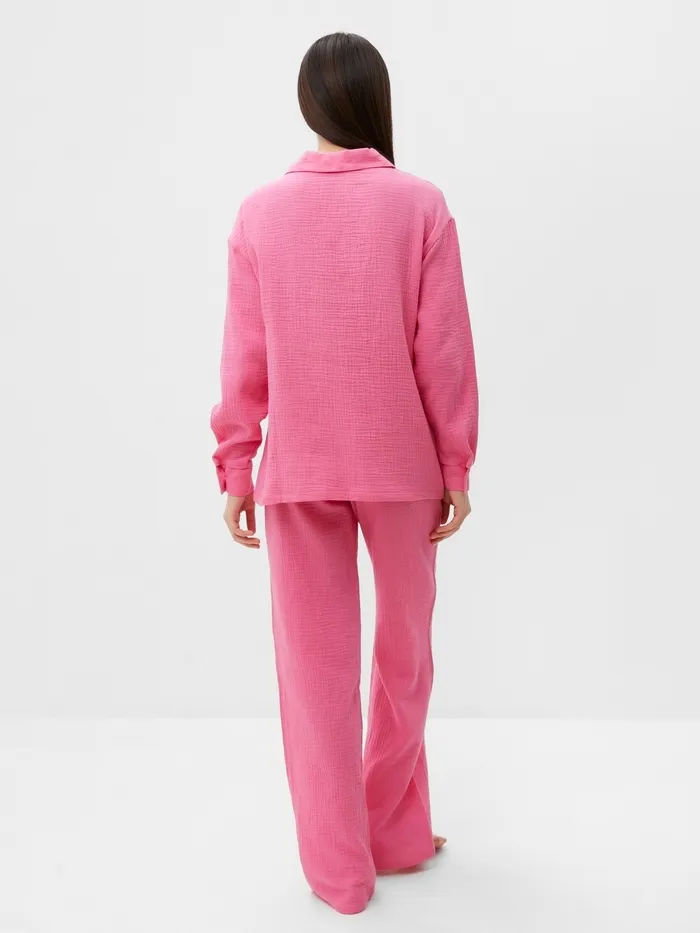 Этот домашний костюм для женщин в нежно-розовом цвете сочетает в себе стиль и комфорт. Комплект включает в себя рубашку и брюки, выполненные из мягкого муслина, идеально подходящего для ношения дома.
