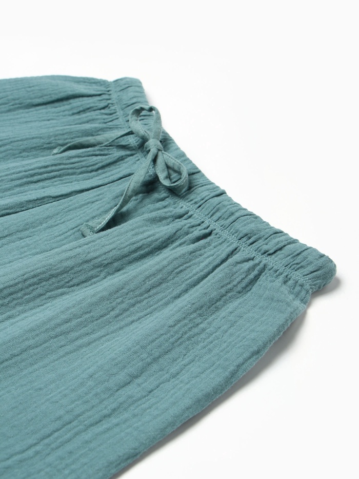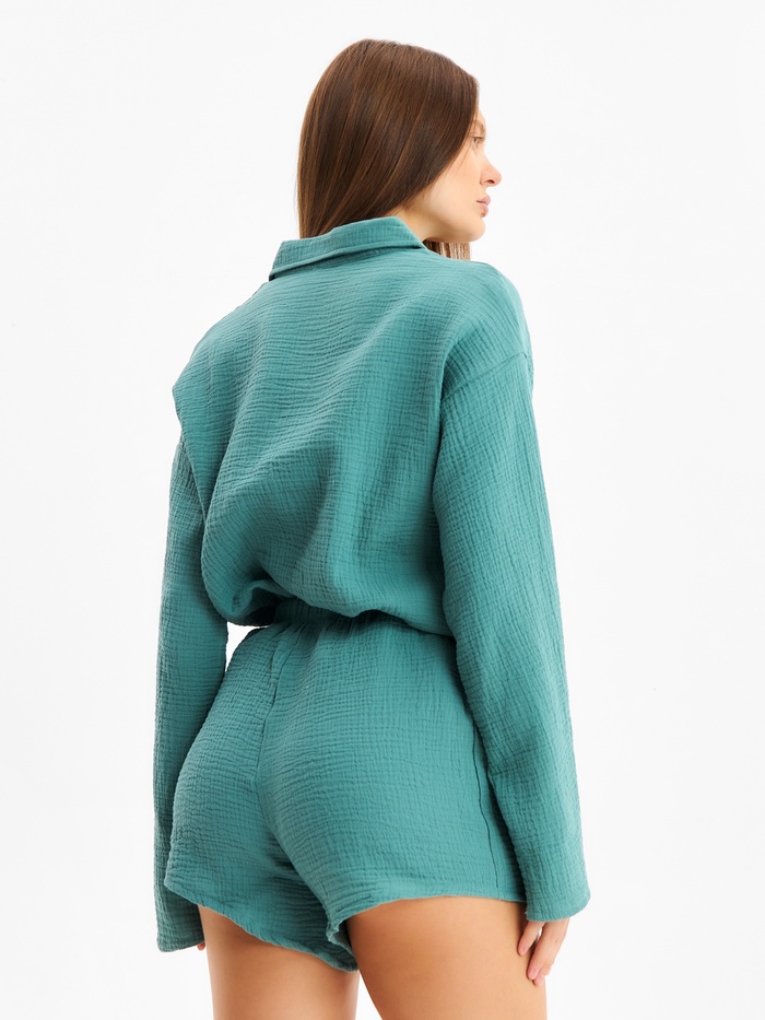 Этот домашний комплект предназначен для женщин, которые ценят баланс между удобством и модным внешним видом. Рубашка из муслина и свободные шорты предоставляют свободу движений, что делает их идеальными для расслабляющих вечеров дома или уютных утренних ритуалов.