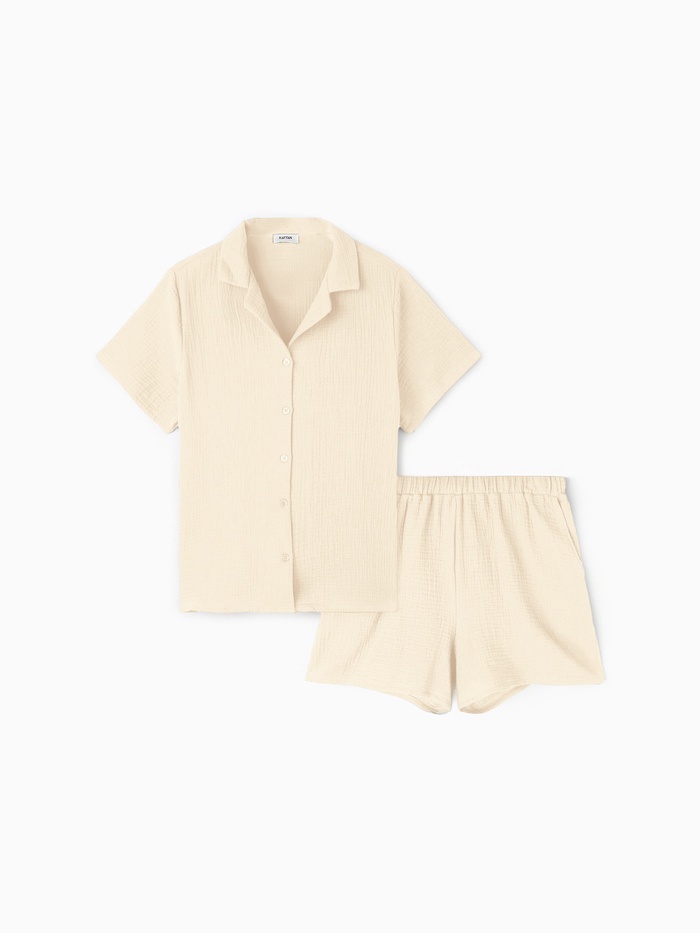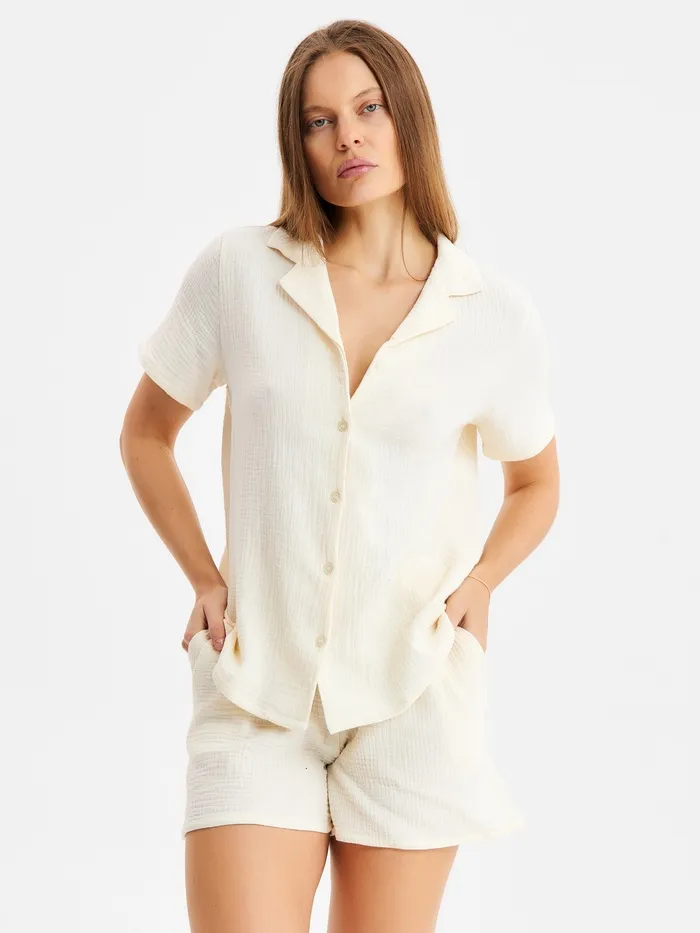 Комплект для дома «KAFTAN Basic»: рубашка и шорты — оптимальный выбор для девушки, ценящей комфорт и стиль. Этот домашний костюм объединяет в себе универсальность и мягкость благодаря лёгкому муслину.