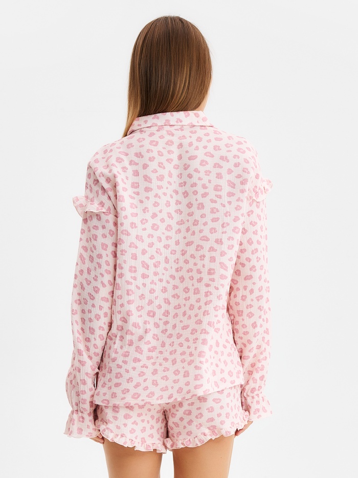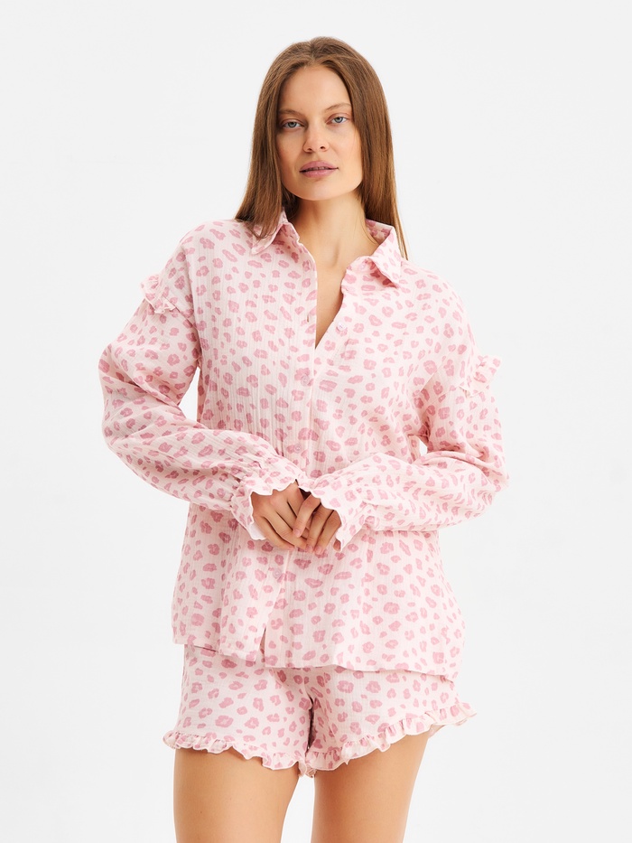 Женский домашний комплект «Розовый леопард» — это стильное решение для комфортного отдыха дома. Костюм (рубашка с длинным рукавом и шорты) выполнен из мягкого, дышащего муслина, который подходит для любого сезона.