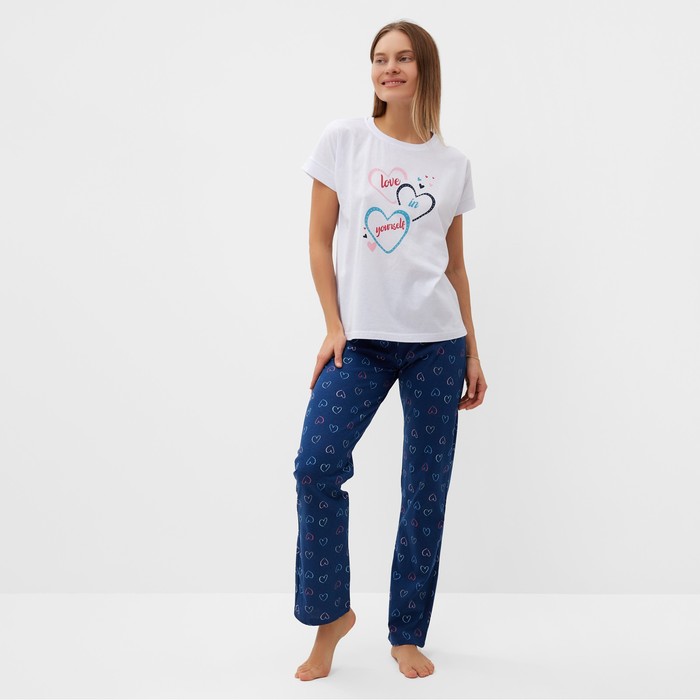 Комплект домашний женский "Сердечки" (футболка/брюки), цвет белый/синий, размер 46