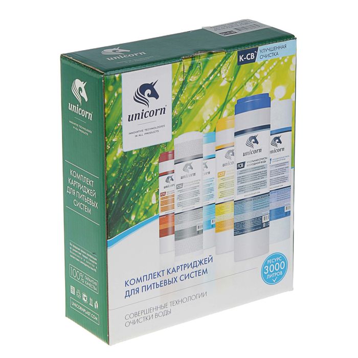Комплект сменных картриджей Unicorn K-CB для глубокой очистки – предназначен для очистки воды в бытовых системах обратного осмоса и трехступенчатых проточных системах для очистки холодной воды, где не требуется умягчение.
