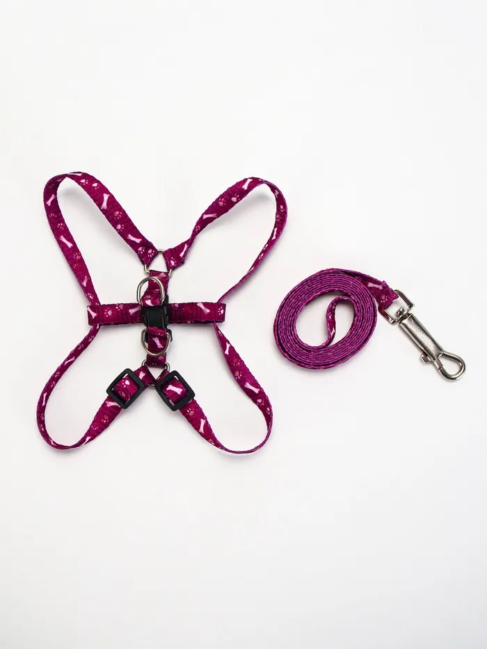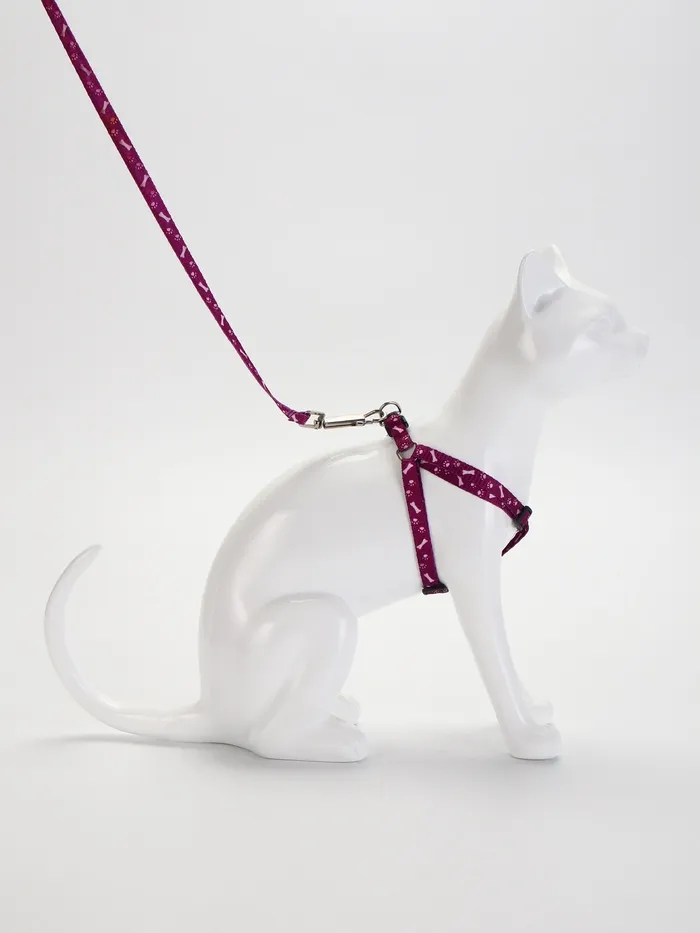 Комплект прогулочный включает в себя яркие шлейку и поводок, изготовленные из качественного капрона с использованием металлической и пластиковой фурнитуры.