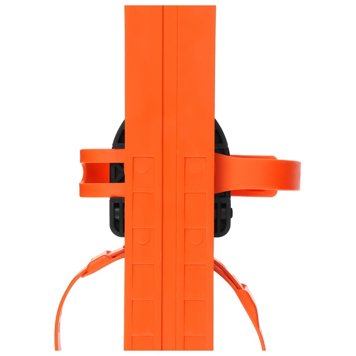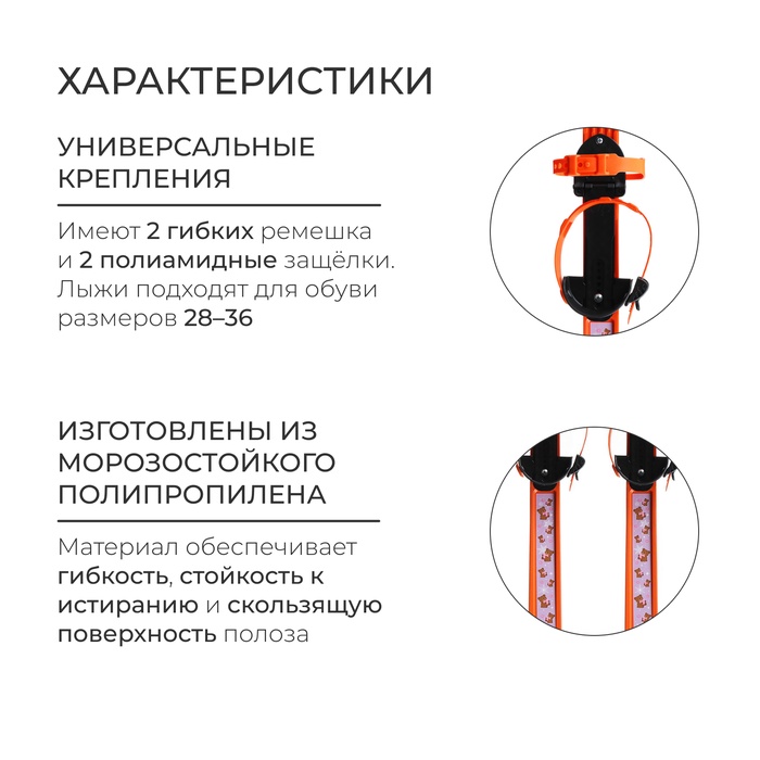 Универсальные крепления имеют 2 гибких ремешка и 2 полиамидные защёлки. Нога фиксируется как в лыжном ботинке. Противооткатная насечка на полозе не даёт лыжам проскальзывать на снегу. Лыжи подходят для крепления к повседневной обуви: 28–36 размеры.