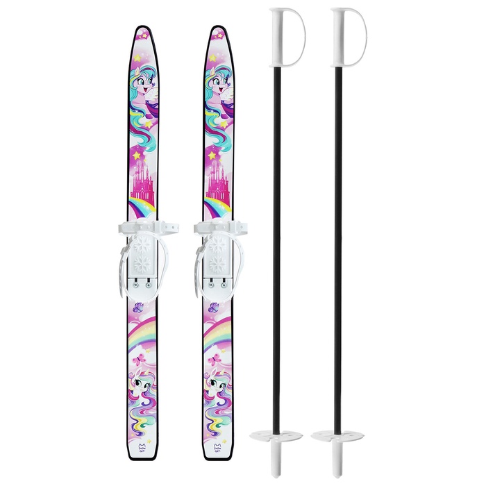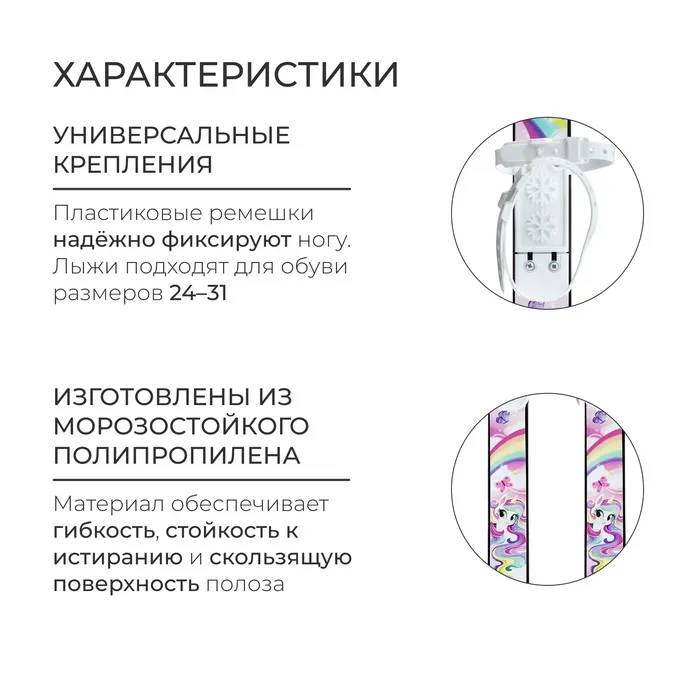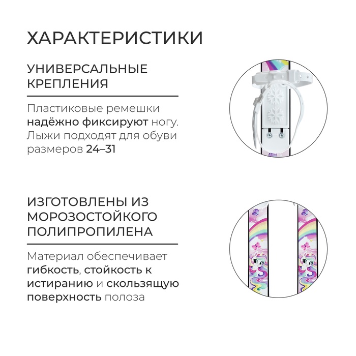 Пластиковые ремешки надёжно фиксируют ногу. Лыжи подходят для крепления к повседневной обуви: 24–31 размеры.
