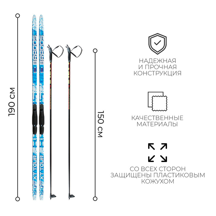 Материал лыжных палок — стеклопластик — гарантирует спортсмену надёжность и прочность всей конструкции, увеличивая срок эксплуатации. Большим плюсом в данной модели является простота подготовки, предварительная обработка не требуется, достаточно встать и поехать.