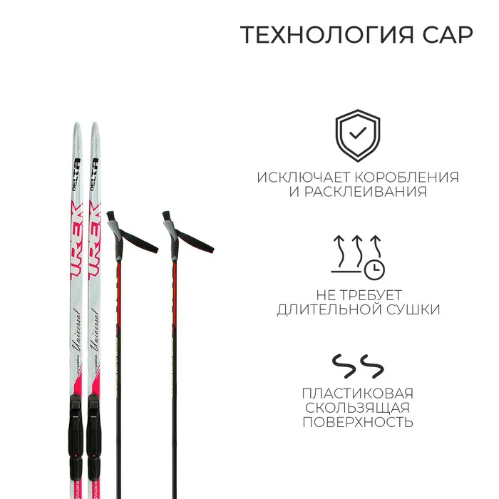 - состав: технология САР. Клин деревянный. Скользящая поверхность: экструдированный ПЭ, геометрия 44. Палки из стеклопластика.