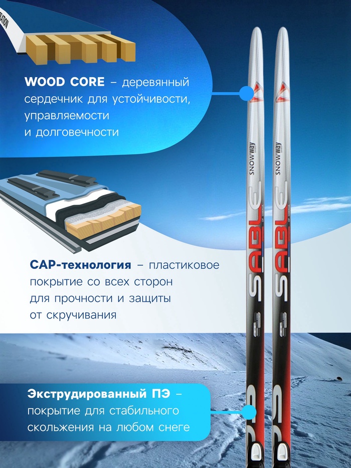 Материал лыжных палок — стеклопластик — гарантирует спортсмену надёжность и прочность всей конструкции, увеличивая срок эксплуатации. Большим плюсом в данной модели является простота подготовки, предварительная обработка не требуется, достаточно встать и поехать.