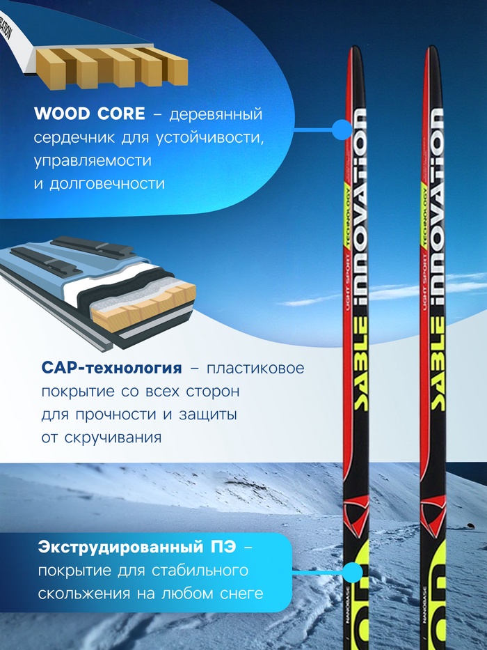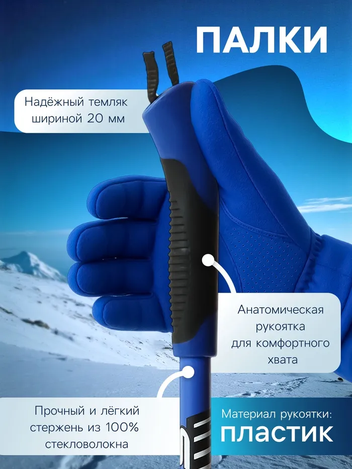 Материал лыжных палок — стеклопластик — гарантирует спортсмену надёжность и прочность всей конструкции, увеличивая срок эксплуатации. Большим плюсом в данной модели является простота подготовки, предварительная обработка не требуется, достаточно встать и поехать.