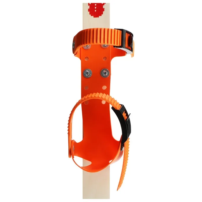 Универсальные двухточечные крепления представлены в виде морозостойкого пластикового ремешка с регулировкой. На нижней поверхности лыжи есть продольная канавка для уменьшения бокового скольжения.
