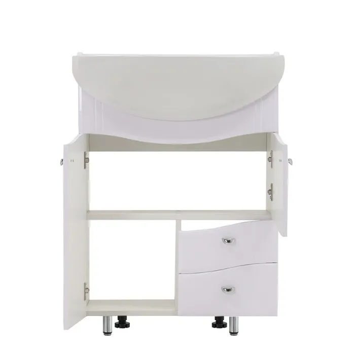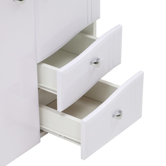Корпус выполнен из влагостойкой ЛДСП 16 мм, кромка — из ПВХ 0,45 мм. Фасады сделаны из МДФ толщиной 16 мм и облицованы глянцевой плёнкой ПВХ белого цвета – она защищает мебель от повышенной влажности. Применение мебельной фурнитуры немецкого производства обеспечивает плавное закрывание ящиков и бесшумный ход дверей.