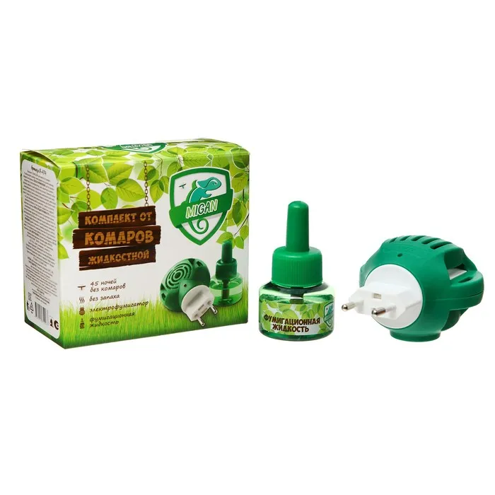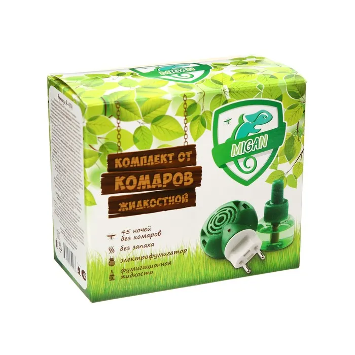 Одним из таких средств является комплект от комаров, который включает в себя фумигатор и флакон объемом 30 мл. Торговая марка, представляющая данный продукт, - ""Migan"".