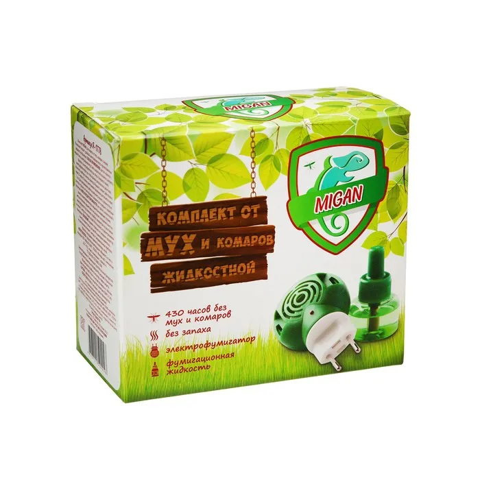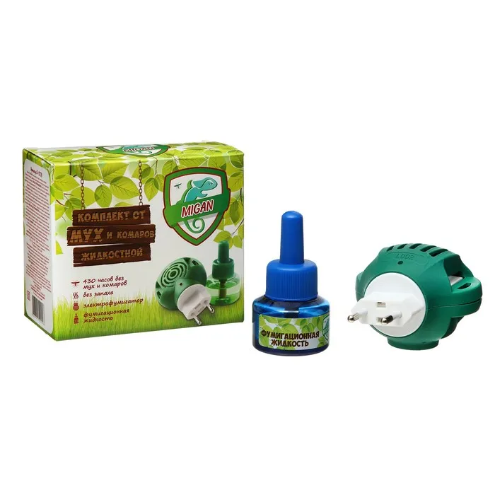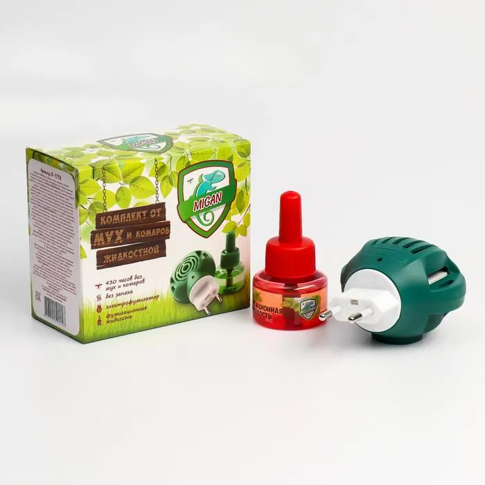 В набор входят: удобный электрофумигатор и фумигационная жидкость во флаконе.